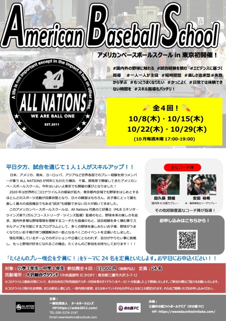 来週10月8日(木)からスタートの「アメリカンベースボールスクール東京」ですが、定員までお集まりいただく事ができました。