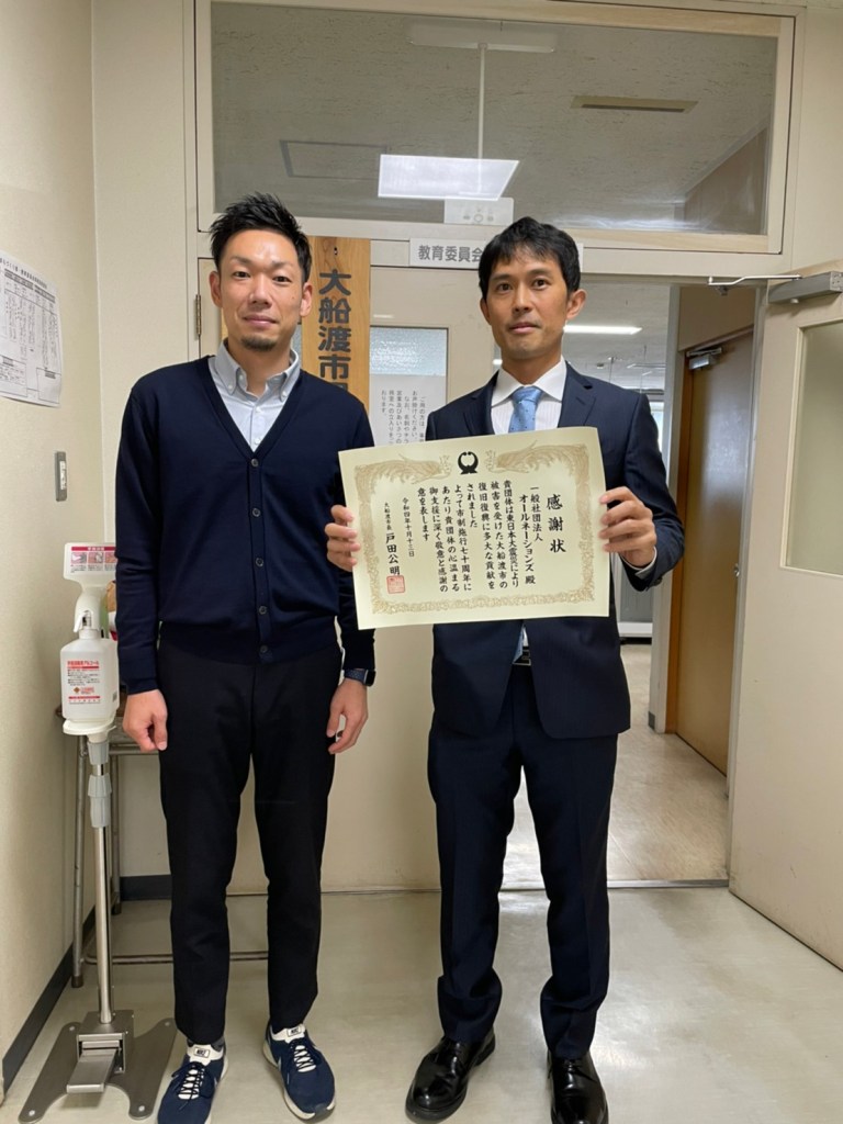 そこで東日本大震災の復興や円滑な市政運営にご支援いただいた企業、団体、個人及び自治体等に感謝状の贈呈を行うという名目のもと、感謝状を頂戴致しました。