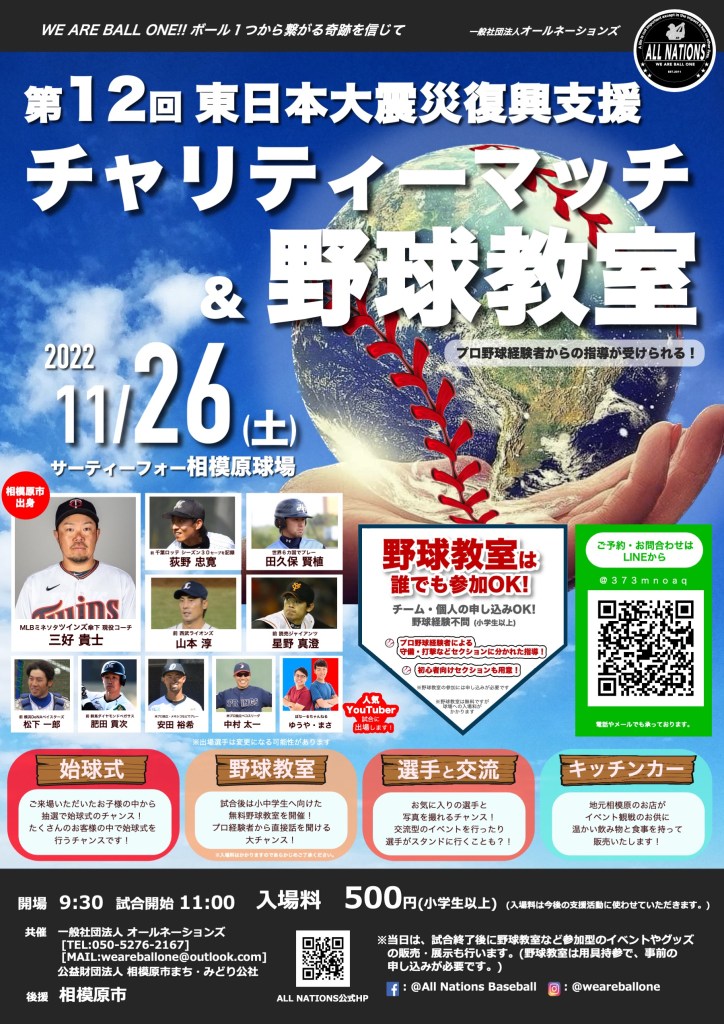 12回目となるオールネーションズの東日本大震災復興支援チャリティーマッチは11月26日㈯に開催です!是非たくさんの方に知っていただき、ご参加いただけるよう、拡散していただけると幸いです。