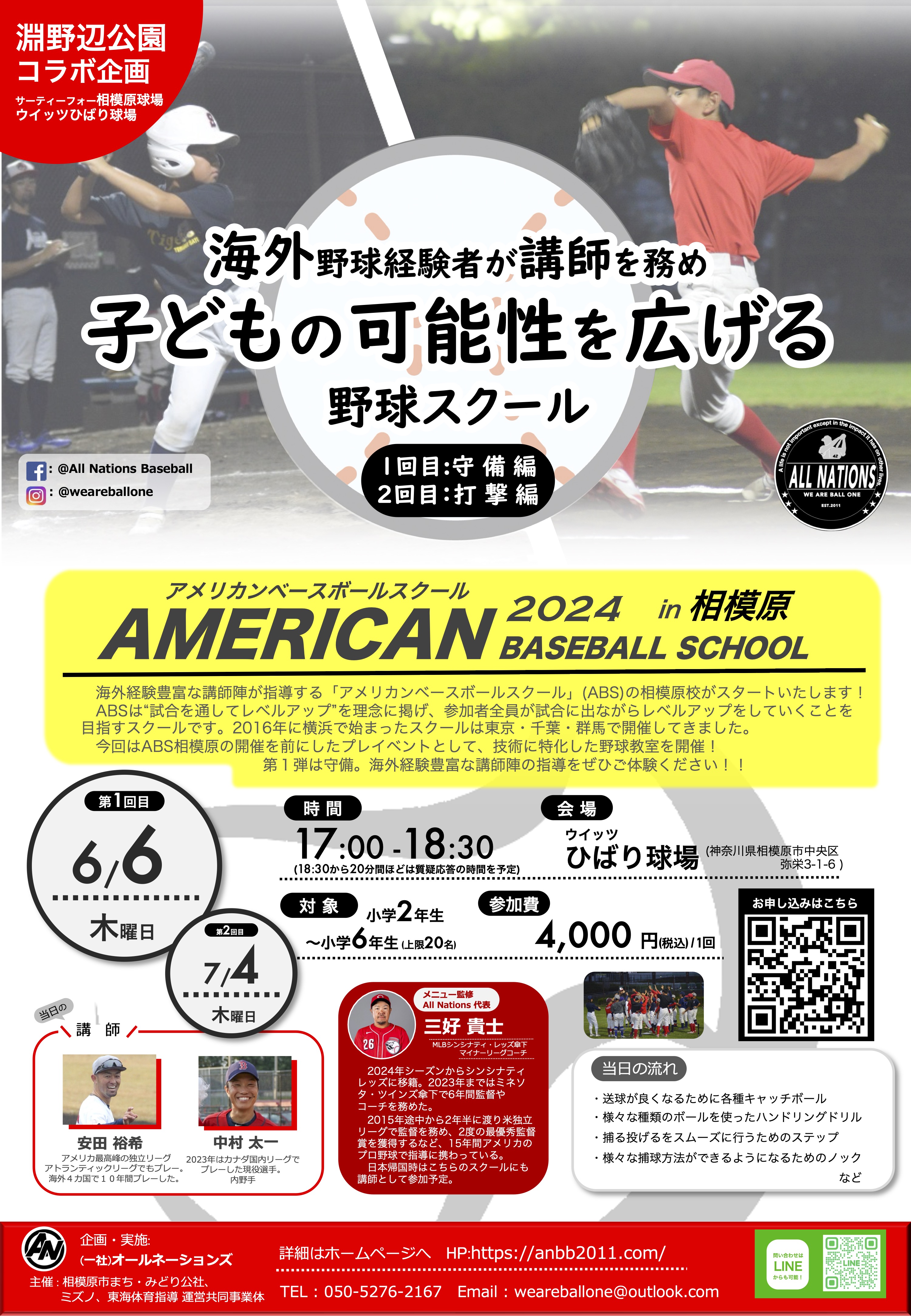 講師は海外経験が豊富なオールネーションズメンバーの安田裕希と中村太一が務めます。メニュー監修には弊団体代表であり、MLBシンシナティー・レッズ傘下マイナーリーグで現役のコーチを務めている三好貴士が行います。三好貴士が日本に帰国中は実際のスクールに講師として参加予定です。今回のプレイベントにご参加いただいた方には優先的に本スクールへのご案内をいたしますので、今回のプレイベントも奮ってご参加いただければ幸いです。
