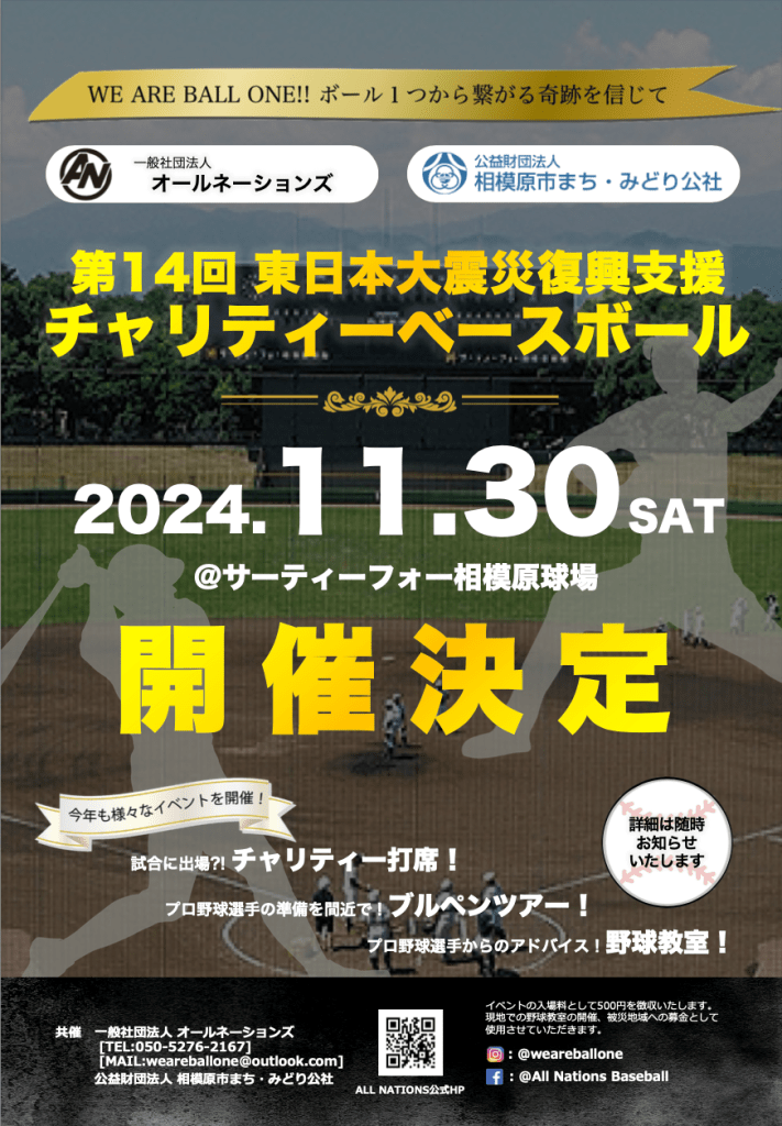 「一般社団法人オールネーションズ」と「公益財団法人相模原市まち・みどり公社」が毎年共催しております、東日本大震災復興支援チャリティーマッチが2024年で14回目の開催となり、今年も開催が決定致しました!