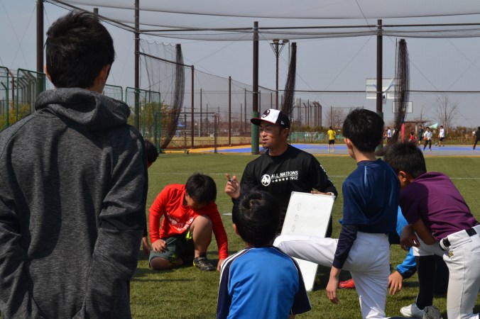 小・中学生を中心に、指導者の方にも参加いただき、オールネーションズ代表の三好貴士から伝えられた、アメリカメジャーリーグミネソタ・ツインズが今年のスプリングトレーニングで行っていたドリルなどをそのまま受講者にお教えしました。