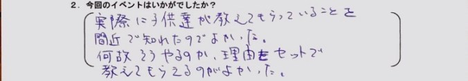 “実際に子供達に教えているところを間近で見れてよかった。何故そうやるのかをセットで教えてもらえるのが良かった”