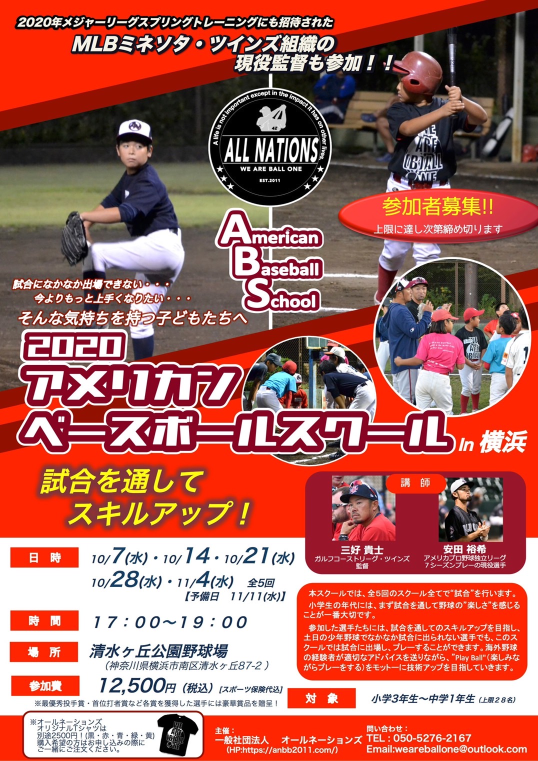 また10月7日(水)からスタートの「アメリカンベースボールスクール横浜」は残り参加枠が1名となっておりますので、引き続きご検討中の方はお早めにご連絡いただきますよう、宜しくお願い致します。