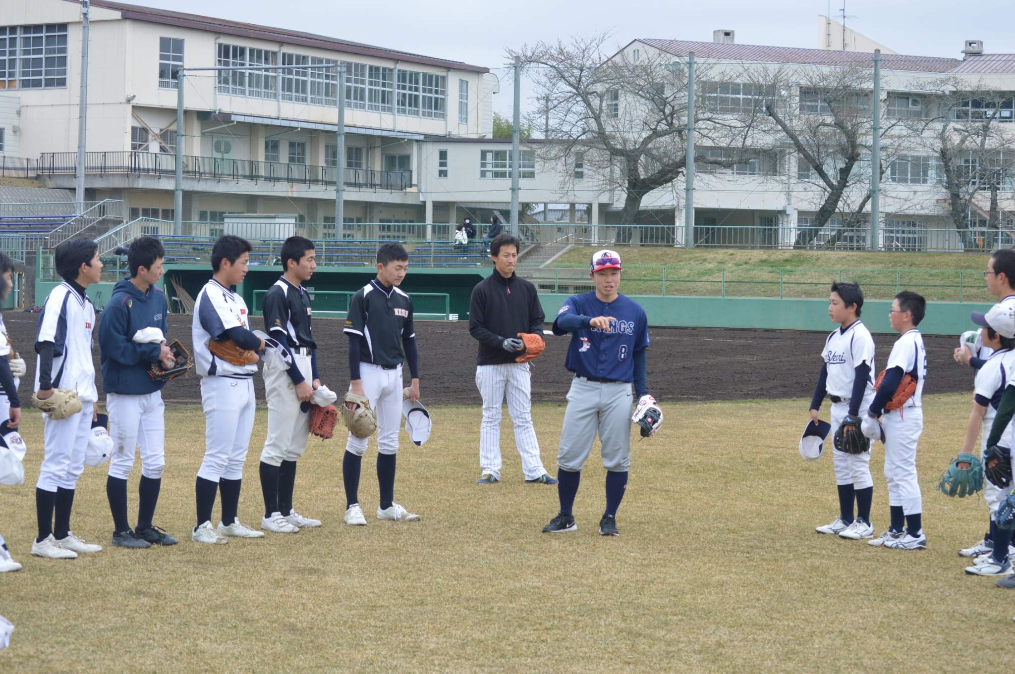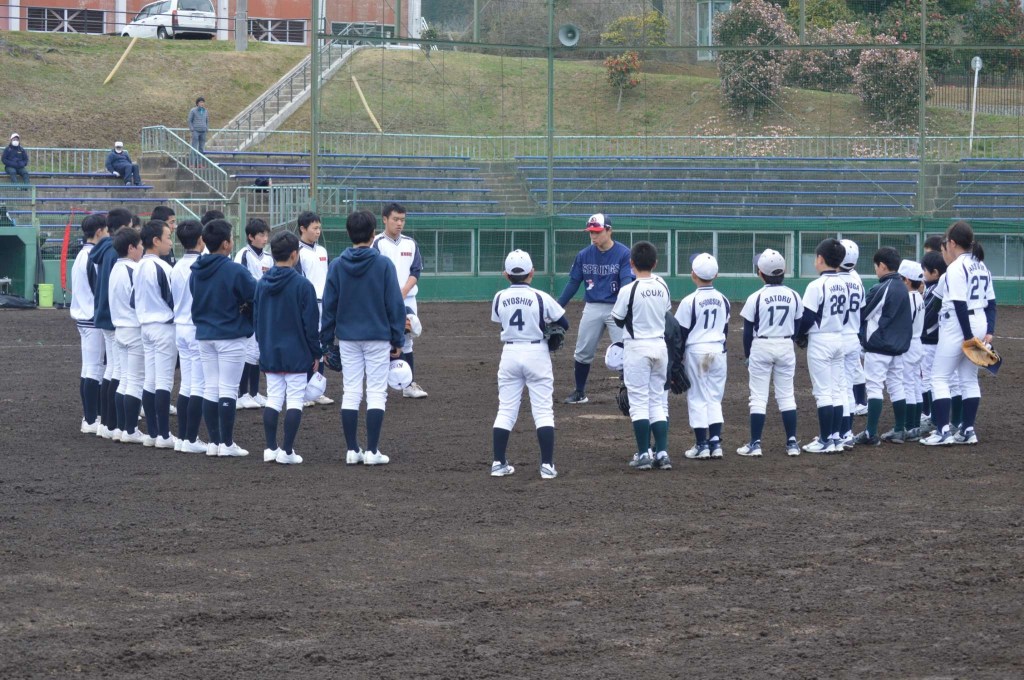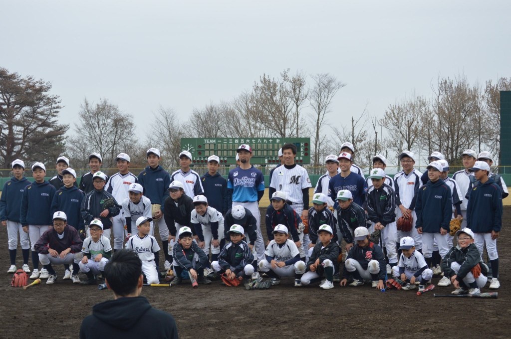 今回のチャリティー野球教室には大船渡市近辺の小中学生48名にご参加いただき、講師には千葉ロッテで活躍された荻野忠寛をはじめとする、安田裕希、清水広貴、中村太一のメンバーが務めさせていただきました。寒空の中ではありましたが雨に降られることもなく無事開催することができました。